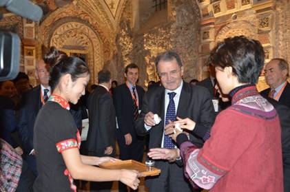 (肖文静同学为欧盟委员会前主席、意大利前总理罗马诺・普罗迪奉茶)
