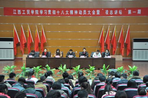 (学工处团委 报道)为高举中国特色社会主义旗帜,全面学习贯彻党的十八大会议精神,以邓小平理论和“三个代表”重要思想为指导,深入贯彻落实科学发展观,着重宣传党的十七大以来党和国家取得的辉煌成就,进一步坚定理想信念,以实际行动学习贯彻落实党的十八大精神,为建设省级示范性高职院校而努力。2012年12月14日下午在学术报告厅,江西工贸学院组织学生开展学习贯彻十八大精神动员大会暨“凌志讲坛”第一期活动。活动首先由学院党委宣传部部长谢继勇宣读了《关于组织学习贯彻党的十八大精神系列活动的方案》;其次由江西财经大学学生工作处处长王金海为全场师生作十八大精神专题报告。