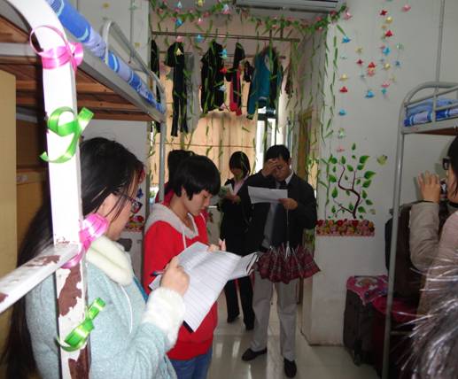 (学工处 石红报道)为了培养学生良好的生活卫生习惯,营造整洁、舒适的住宿环境,打造经典寝室文化,增强大学生自主自律意识,推进和谐寝室文化建设的发展, 2012年11月15日中午,宿管中心组织开展了“我爱我家”寝室美化设计大赛。通过现场评分并结合参赛寝室提交的相关材料,将评选出10个“我爱我家”寝室美化设计大赛优秀寝室。
