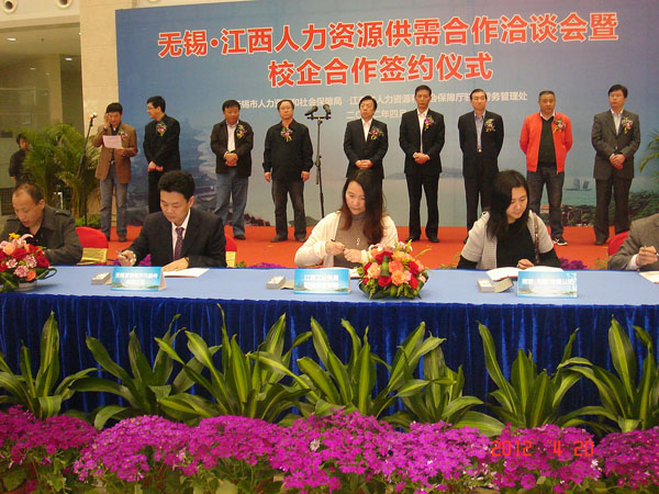 (就业处 顾筱玲报道)2012年4月19日,就业处顾筱玲代表学院赴无锡参加了由无锡市人力资源和社会保障局和江西省人社厅驻江苏省办事处联合举办的“无锡・江西人力资源供需合作洽谈会暨校企合作签约仪式”.