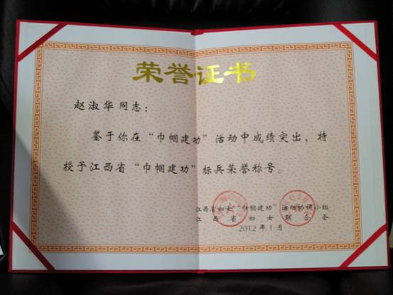 陈大梅报道)赵淑华同志被江西省“巾帼建功”活动小组、江西省妇女联合会授予江西省“巾帼建功”标兵荣誉称号。