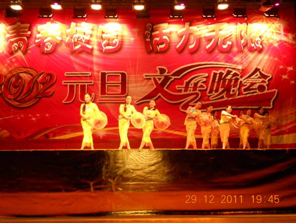 在喜庆的《春节序曲》中,现场观众一起观看了由在2011年荣获国家级、省级、市级比赛奖项的代表带来的祝福视频。接着,在院大学生艺术团合唱团演唱的雄壮的《迎风飘扬的旗》中晚会正式拉开了序幕,在主持人的调动下,晚会现场气氛热烈,学院院长邓小红在晚会致了新年贺词,肯定学院2011一年成绩的同时也提出了学院未来的发展方向。在工作人员的共同努力下,晚会有条不紊的进行,有形式多样、风格不同的舞蹈,如:工程技术与艺术设计系选送的《律・火》、信息科学系选送的《新沂蒙颂》、工会文艺部选送的《万泉河水》、大学生艺术团选送的《樱桃树下》、经济贸易系选送的《boys-b-flygirls》、信息科学系选送的《西班牙斗牛士》、工会和院街舞社选送的《they don’t care about us》、旅游商务系选送的《哇唔》和《燃烧的火把节》;此外,机电技术系选送的《我的爷爷》、院学生会选送的《卖西瓜》、工程技术与艺术设计系选送的《武林歪传》、工会青工部选送的《全都忙》都让现场观众笑的前仰后合;另外,党委宣传部和工会选送的架子鼓表演唱《相信自己》和工贸大舞台2011年度总决赛冠亚季军和老师带来的歌曲联唱《相亲相爱》、也掀起了晚会的阵阵高潮,最后,晚会在工会选送的联唱《举杯吧朋友》中落下了帷幕。