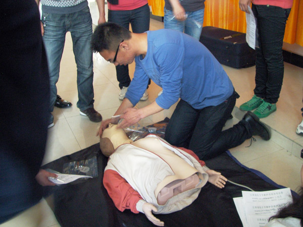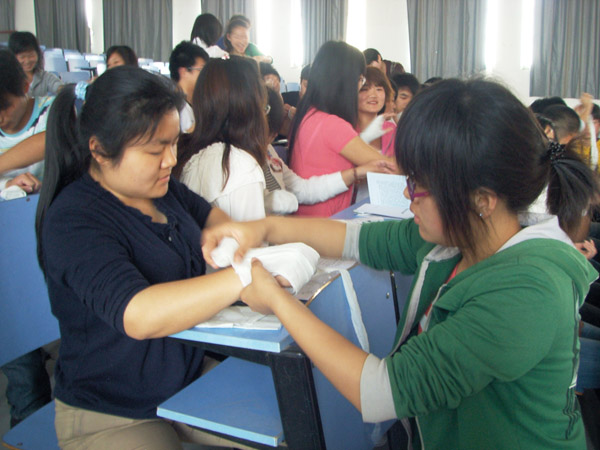 (总务处 景燕萍报道)我院第一期现场应急救护培训班于2011年4月23日下午进行,本期培训对象为2010级各班班干部、学生军训教官及部分学生会干部。培训内容:以现场的、初级的、易于掌握的适用知识和实践操作为主,具体包括:止血、包扎、骨折固定、伤员搬运等创伤救护四项基本技术,现场心肺复苏技能等。学员通过理论和实践操作考核,掌握了初级救护知识和技能,省红字学会将给这批学员颁发《救护员证书》。