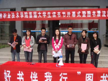 (院团委李芝报道)2010年4月23日,我院首届校园读书节开幕式暨图书漂流活动启动仪式在我院标志性建筑――图书馆门口举行。出席此次活动的有院团委王星书记,院团委副书记罗卫兵、李芝及各系团总支书记。院团委书记王星为此次活动致了开幕词并宣读倡议书,宣布读书节的活动主题――阅读改变人生,读书就是希望;并对这次的读书活动提出了要求。接着,院团委副书记罗卫兵向同学们介绍了读书节的由来并宣读了读书活动的方案。