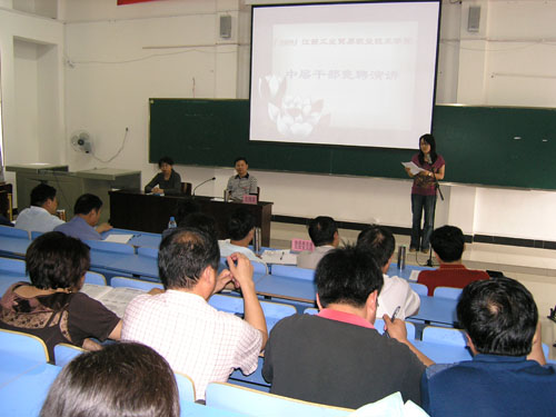 为进一步优化干部队伍结构,建立充满活力的干部管理机制,充分调动干部的工作积极性,提高管理水平和工作效率,为学院的建设与发展提供强有力的组织保证。根据《江西工业贸易职业技术学院中层干部竞聘上岗实施方案》,学院中层干部竞聘上岗工作经过公开报名、资格审查,笔试、竞聘演讲、党委考察等环节,于6月10日圆满结束。