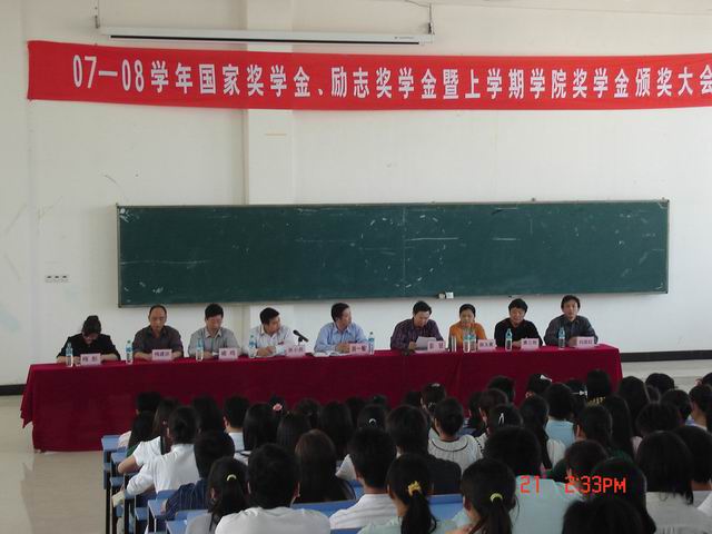 (学工处 罗卫兵)4月21日下午,我院2007-2008学年国家奖学金、国家励志奖学金暨上学期学院奖学金颁奖大会在第一公共教学楼504室隆重举行。学院党委专职副书记肖一敏、副院长彭锐应邀出席,会议由学工处副处长宋小兵主持。学工处相关负责人、各系党支部书记、辅导员及400余名学生代表参加了大会。