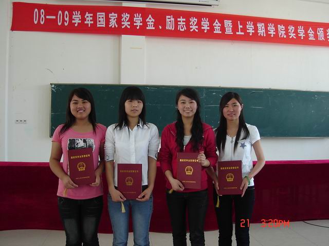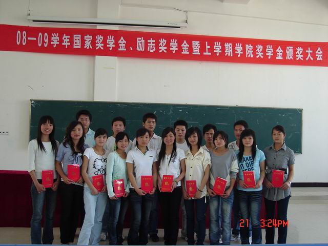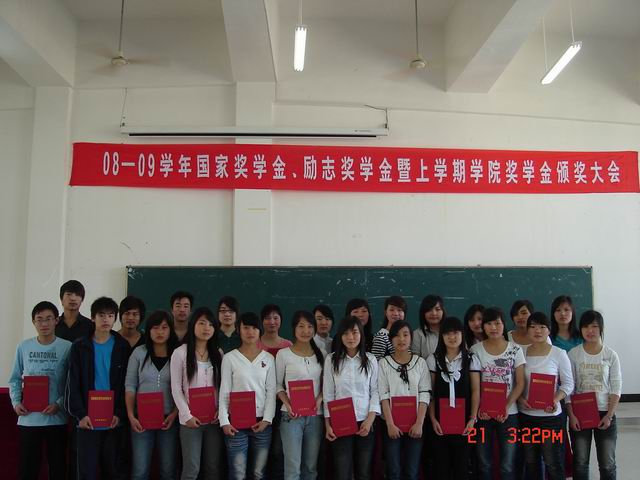 据悉,在08-09学年度,我院共有5名同学获得国家奖学金,168名同学获得国家励志奖学金;在08-09学年上学期学院先进学生个人评选中,有844人获得学院奖学金,697人次获得“先进个人”荣誉称号。