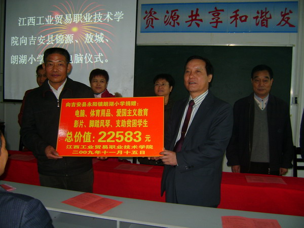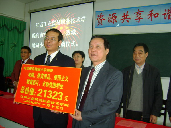 我院的对口支援活动,受到当地的县政府和受援点三所小学校长的高度重视。在捐赠仪式上,吉安县副县长吴巧娥对我院一行的浓情厚意表示深深感谢,并对小学生们提出了殷殷希望,希望他们长大成人后能牢记江西工业贸易职业技术学院的帮扶,并以自己的实际行动回报社会,将爱传承。吉安县教育局局长、党委书记曾宪锋、校长代表肖海涛、学生代表也分别在仪式上对我院的援助之情表示谢意!