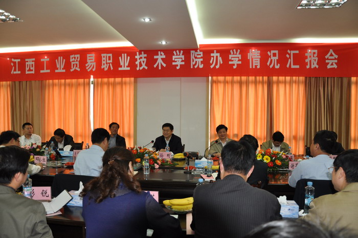 省教育工委书记、省教育厅厅长虞国庆在汇报会上作了讲话。他指出,江西工业贸易职业技术学院在省委省政府的正确领导下,在省粮食局的直接领导下,围绕稳定规模、优化结构、提高质量、办出特色,在“三定”工作上取得明显的成效。希望学院认真学习孙副省长的重要讲话精神,积极开拓,锐意进取,坚定不移地走质量立校、特色兴校的办学道路。他还表示,省教育工委、教育厅在学院招生计划、省级示范院校申报工作等方面将给予学院大力支持。