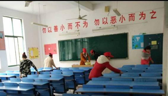 在此次活动中,一部分同学们主要负责将遗落在绿化带里的一些垃圾与枯枝败叶清理干净,同学们一到现场,将垃圾捡起装在提前准备好的袋子里,搁置在各条道路沿边的垃圾桶里。一部分同学对教室的桌椅、黑板,进行了彻底的大扫除。