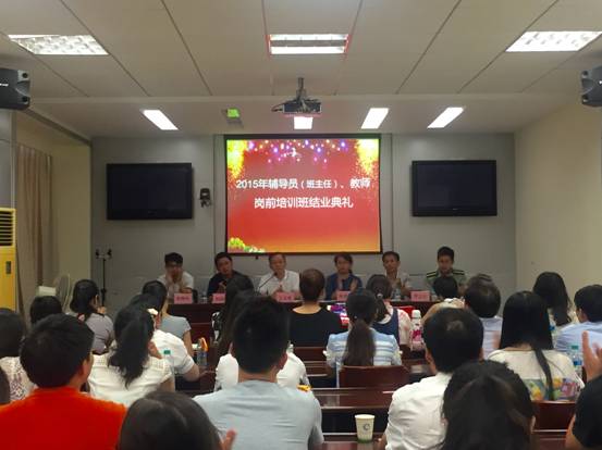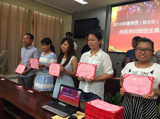 结业典礼上周晓邑处长和赵淑华副院长分别宣读了《关于2015年辅导员(班主任)、教师岗前培训班结业的通报》和《关于表彰2015年辅导员(班主任)、教师岗前培训班优秀学员的决定》,并为结业学员和优秀学员颁发了辅导员聘书和荣誉证书。