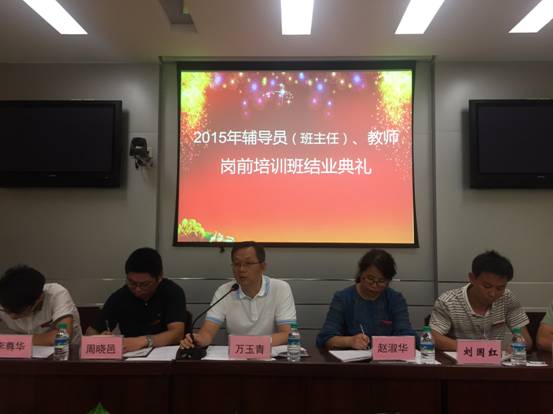 (学工处 梁思晨报道)8月24日下午14:00,2015年辅导员(班主任)、教师岗前培训班结业典礼在行政楼411室顺利举行。院长万玉青、副院长赵淑华、组织人事处处长周晓邑、教务处处长刘国红、学工处处长李尊华出席了本次结业典礼。会议由学工处副处长罗卫兵主持,36名学员参加。