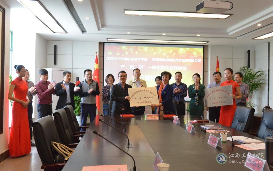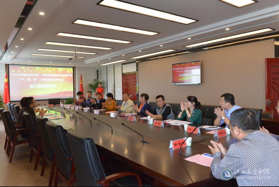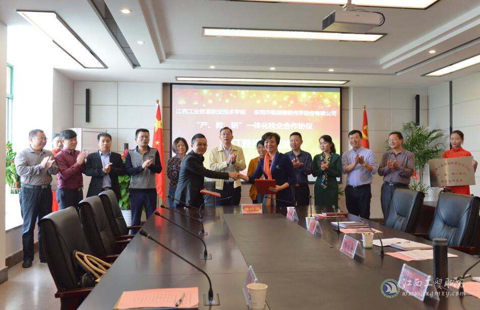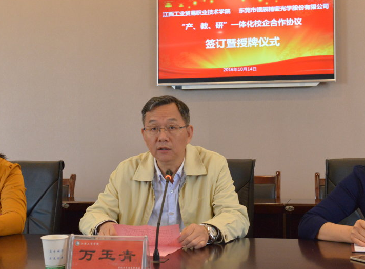 2016年10月14日上午,江西工贸职院与东莞市银辰精密光电股份有限公司产、教、研一体化校企合作项目签约暨授牌仪式在行政楼415会议室隆重举行,学院党委书记、院长万玉青出席签约仪式并致辞,东莞市银辰精密光电股份有限公司董事长米银春和学院副院长雷筱芬分别代表双方签订校企合作协议并相互授牌,学院副院长赵淑华、教务处处长李晓云、党办·宣传部主任宋小兵、就业处处长文莹、院办副主任王佳以及机电工程系主任杜渊、副主任刘耀元、郑海林、数模教研室主任黄勇刚出席签约仪式,仪式由赵淑华副院长主持。
