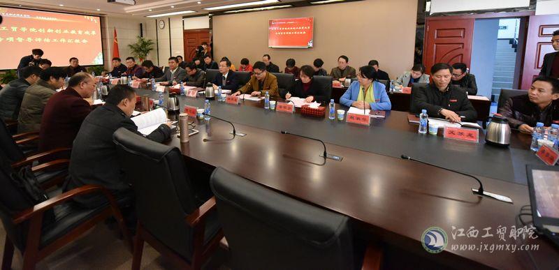 评估组组长廖忠明对学院在创新创业方面取得的成绩表示赞许,对学生实训、专业引领等特色做法和成效给予肯定,并简要说明了此行的目的、任务及现场评估程序。