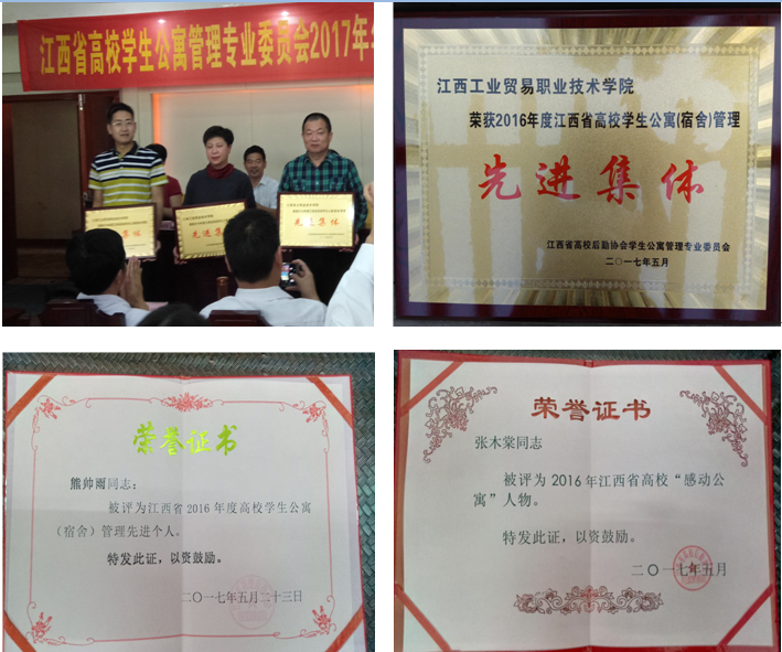 我院宿舍管理工作再创佳绩,今年一次性斩获了此三项殊荣,学院荣获了2016年度江西省高校学生公寓(宿舍)管理“先进集体”称号,宿管中心熊帅雨老师被评为江西省2016年度高校学生公寓(宿舍)管理“先进个人”,宿管员张木棠同志被评为2016年江西省高校“感动公寓”人物。