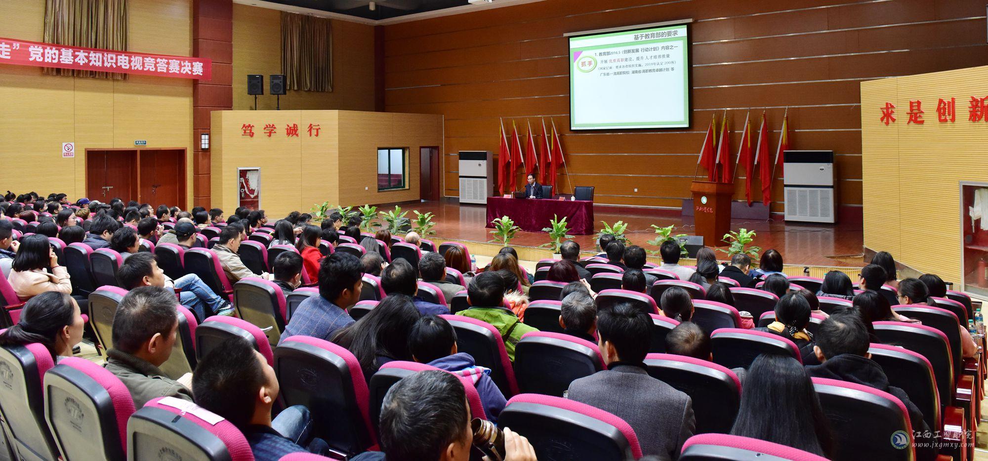为进一步推动学院优质院校建设,11月18日,江西工业贸易职业技术学院邀请我国职教著名专家,浙江机电职业技术学院院长丁金昌教授作“优质院校建设”专题报告。在家院领导党委书记万玉青,院长雷筱芬,调研员郝育忠,副院长周晓邑,纪委书记万晓波,院长助理艾苏龙等领导,以及全院教职工到场聆听。学院院长雷筱芬主持报告会。