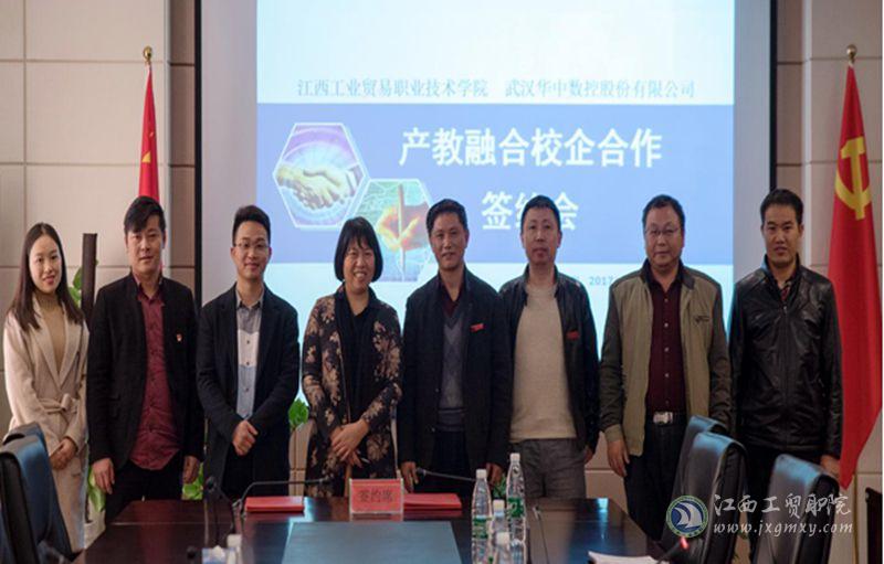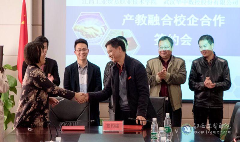 在热烈的掌声中,学院代表院长助理艾苏龙和武汉华中数控有限公司总裁助理刘怀兰双方签定了《江西工业贸易职业技术学院——武汉华中数控股份有限公司产教融合校企合作备忘录》,并合影留念。
