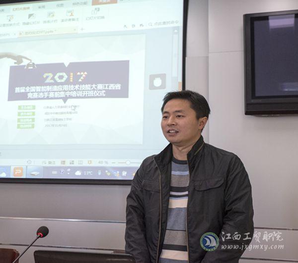 11月26日, 2017首届全国智能制造应用技术技能大赛江西省竞赛选手赛前培训班开班仪式在江西工业贸易职业技术学院(江西工贸高级技工学校)举行。本次活动由江西省人力资源和社会保障厅主办,武汉华中数控股份有限公司承办,江西工贸高级技工学校协办。参会嘉宾有省人社厅职建处熊杰、武汉华中数控股份有限公司总裁助理刘怀兰博士、江西工业贸易职业技术学院院长助理艾苏龙,以及江西省9个代表队的35名参赛选手。本次活动由江西工业贸易职业技术学院机电工程系主任杜渊主持。