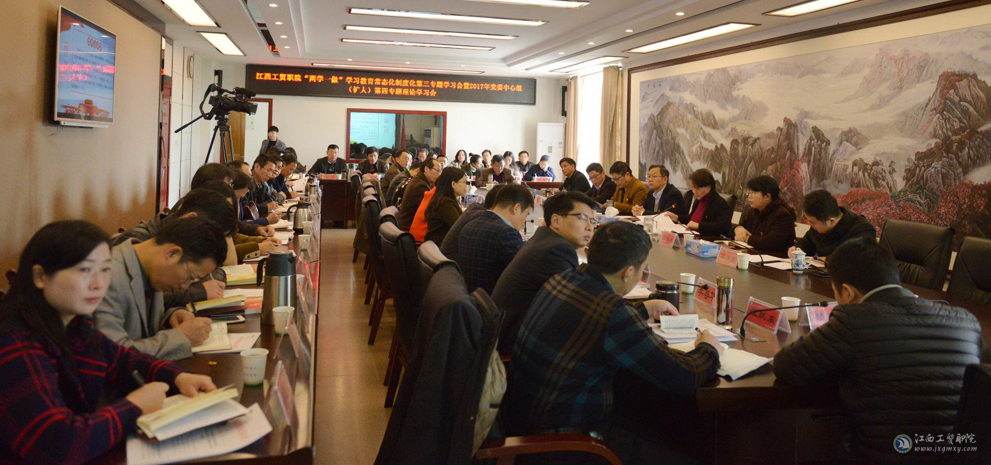 11月24日,江西工业贸易职业技术学院召开2017年党委中心组第四专题学习会,重点围绕党的十九大精神和“两学一做”学习教育常态化制度化第三专题进行学习研讨。学院党委书记万玉青主持并作讲话,全体中层以上干部参加会议。