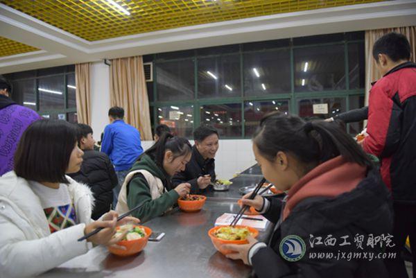 课外活动结束后,艾院助和同学们相约来到食堂,一起排队、一起打饭和一起用餐,并询问同学们:一个月生活费要多少钱?食堂的饭菜性价比何?平时喜欢到食堂吃还是点外卖等情况,并询问同学们对食堂饭菜及学院管理的看法与建议。