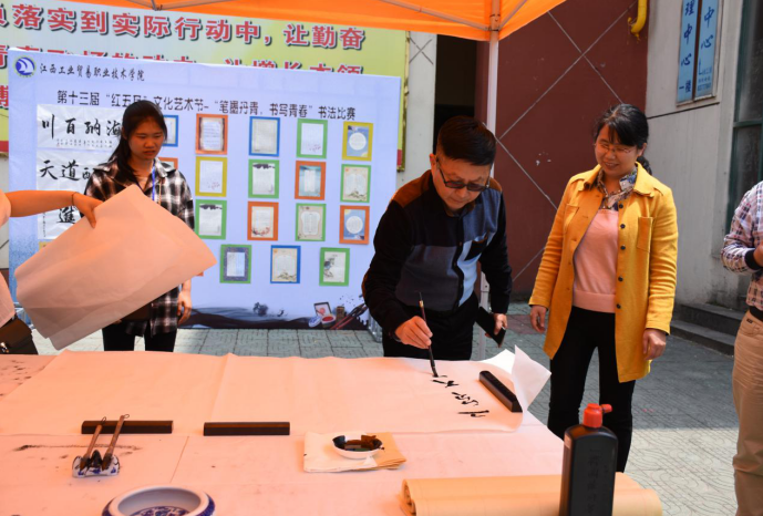 为进一步弘扬中华民族优秀传统文化,丰富校园文化底蕴,提升当代大学生的个人文化修养、审美情趣,4月25日中午第十三届“红五月”文化艺术节-“笔墨丹青,书写青春”书法比赛在学院食堂门口成功开展。