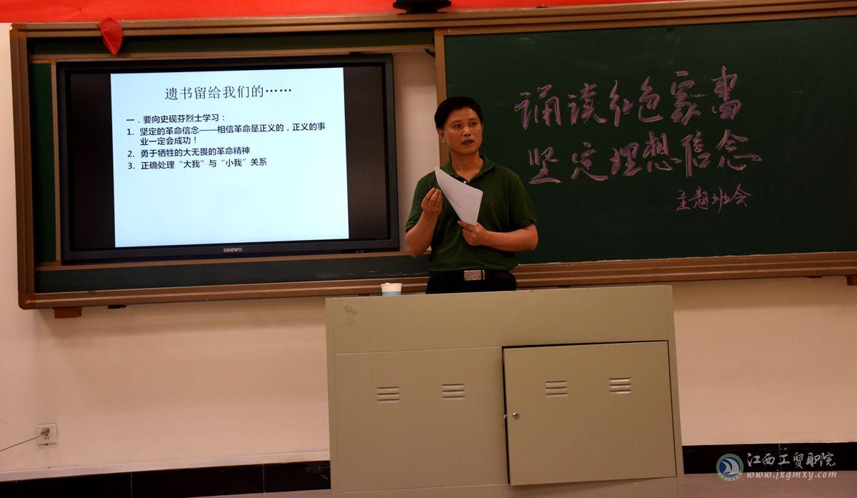 下午4:10,艾苏龙来到思泽楼403教室参加第十一期学生军训教官大队组织的 “诵读红色家书,传承红色基因”主题班会。在班会上,首先学生教官分组进行了诵读《红色家书》,随后,艾苏龙向同学们推送了革命烈士史砚芬就义前给弟弟妹妹的遗书《弟妹!今生就这样与你们作结了!》,他饱含深情、绘声绘色的诵读仿佛把大家带回了那个战火纷飞、家国动荡的特殊年代。革命烈士们的红色家书给了我们精神的力量,前行的动力,激励我们不忘初心、坚定信念。最后,艾苏龙向全体教官提出四点希望:一是要志存高远,珍惜来自不易锻炼机会;二是要明确目标,善于思考,掌握科学方法;三是要坚定意志,完成各项技能训练任务,四是要有“工匠精神”,做到精益求精,好上加好,能在校园里树立好榜样。