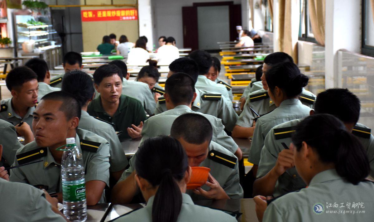 主题班会结束后,艾苏龙与学生教官相约来到食堂,一起用餐,并询问同学们学习、生活、训练情况。