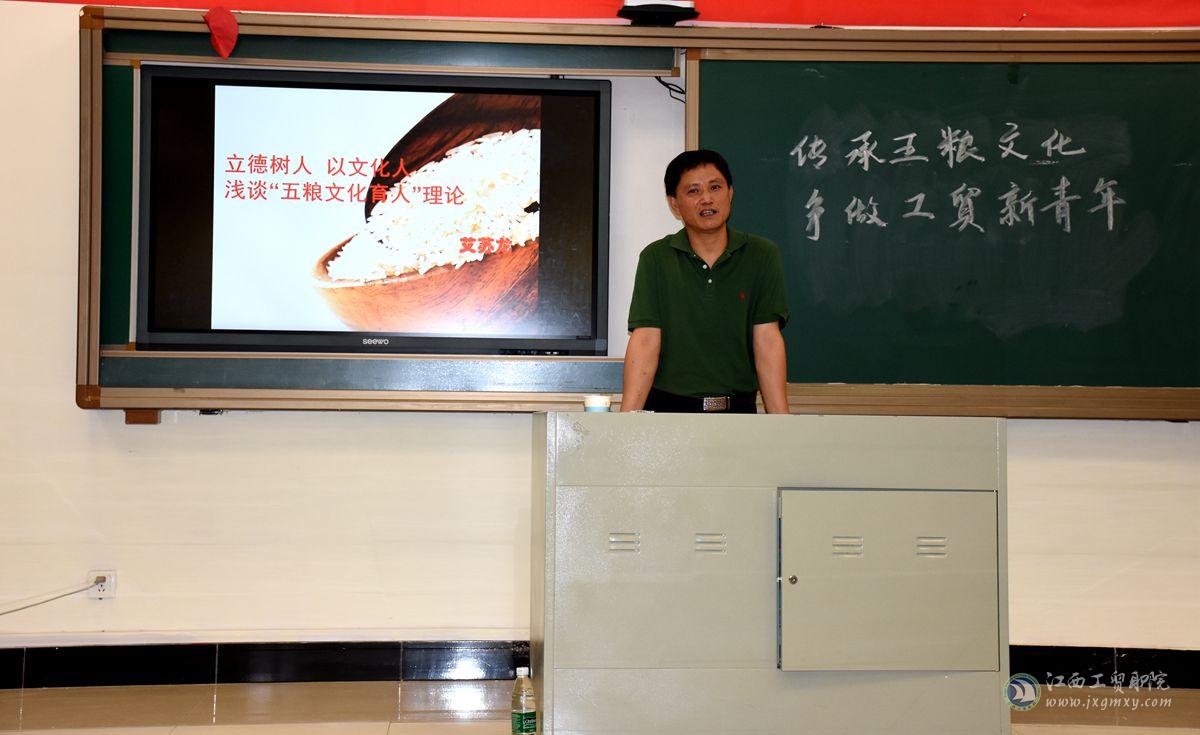 傍晚18:40,艾苏龙来到食堂三楼,在社团负责人张帆老师的引导下分别察看了舞蹈队、合唱团、书法协会、吉他协会、心理协会等学生社团的训练情况,他高度评价了学生社团的发展,学生积极加入社团,有利于丰富学生课外生活,通过社团活动交流思想,切磋技艺,互相启迪,增进友谊,是实践育人工作的重要载体。晚上19:30,艾苏龙来到思泽楼403教室,为全体社团负责人上了一堂主题为“浅谈五粮文化育人理论”的思政课。他深入浅出的向大家介绍了学院“五粮文化育人”理论的基本内容,即粮缘中的敬与礼、粮情中的勤与俭、粮品中的诚与信、粮安中的责与献、粮艺中的传与新。通过学习,大家纷纷表示,今后会将“五粮文化”融入社团文化中,努力弘扬中华传统文化,争做