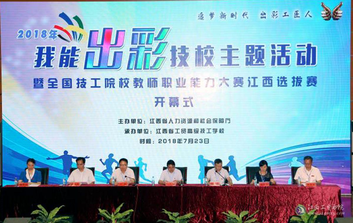 为深入贯彻党的十九大精神,落实人力资源和社会保障部《技工教育“十三五”规划》的有关要求,进一步提高技工院校教师职业能力,7月23日上午,2018年“我能出彩”技校主题活动暨全国技工院校教师职业能力大赛江西省选拔赛在江西工贸高级技工学校开赛。省人社厅党组成员、副厅长刘克琦,省粮食局党组成员、总工程师廖小平,省粮食局人事教育处处长方雅芸,省纪委驻省人社厅纪检组副处级纪检员张鸣天,省人社厅职业能力建设处副处长淦勇以及在家校领导万玉青、雷筱芬、郝育忠、赵淑华、但志亮出席开幕式,开幕式由省人社厅职业能力建设处副处长淦勇主持。
