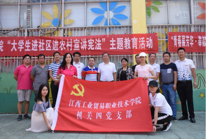 为贯彻落实习近平总书记关于宪法学习宣传教育的重要指示,加强社区法治教育,增强居民学法、遵法、守法、用法意识,提高广大居民的法律素质,推动全社会尊崇宪法、维护宪法、运用宪法。2018年9月15日上午,江西工业贸易职业技术学院机关四党支部带领学生志愿者前往塘山镇上坊路社区开展了宪法宣讲活动。学院党委书记万玉青、省粮食局团委书记成钦虎、学院副院长赵淑华、机关四党支部党员及学生志愿者宪法宣传小分队共同参与宪法宣传活动。