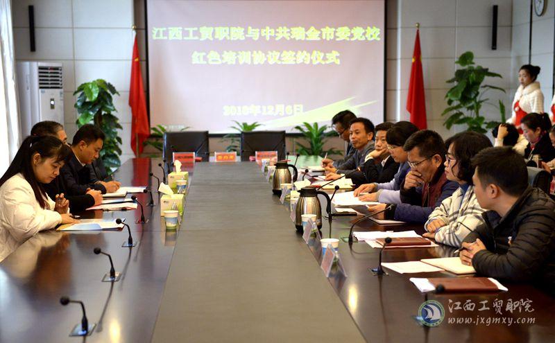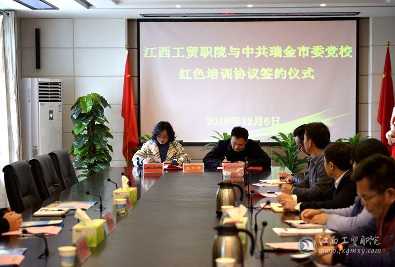 学院党委办公室、宣传部副主任王苏与中共瑞金市委党校培训中心主任赵长峰作为双方代表签订红色培训协议。