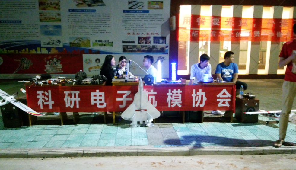 【机电系航模电子协会 报道】9月21日傍晚6:30,机电工程系科研航模电子协会在食堂门口开展了创新作品展示及2016级招新活动,参加活动人员有现任社长邹祚元,航模分社管仲浩、袁双隆副社长,全体成员。