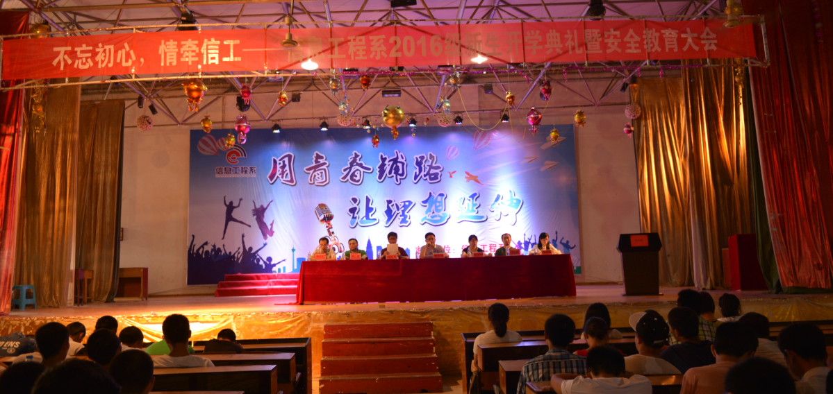 (信息工程系 熊婷报道)在这美丽的金秋时节,信息工程系迎来了2016级新生,为引领新生专业发展,促进学生角色转换,尽快熟悉大学校园生活,9月20日上午9:00,信息工程系在大学生活动中心举办2016级新生开学典礼暨安全动员大会。学院党委委员、调研员郝育忠同志,学院党委委员、工会主席赵淑华同志,信息工程系副主任(主持工作)刘长万同志,电子商务教研室主任余云晖同志,信息技术教研室主任熊浩同志,物联网应用技术教研室主任傅菊春同志,信息工程系行政人员,16级辅导员(班主任)及2016级全体新生参加了此次大会。大会由信息工程系分管学生管理工作副主任马龙凤同志主持。