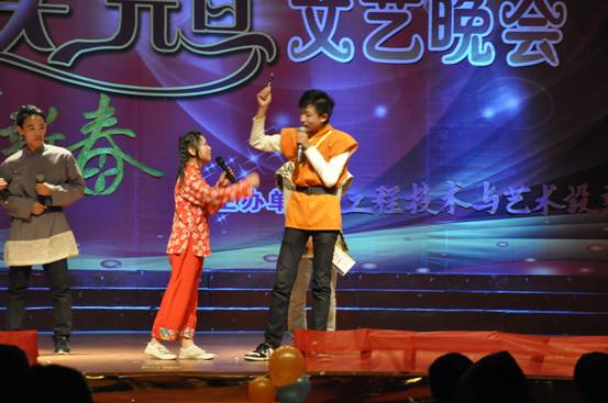 动感的歌舞《喜乐中国娃》拉开了元旦晚会的帷幕。随后,系主任艾苏龙代表主办方为在场所有老师和同学们送上新年祝福。联欢中,师生们载歌载舞,自编自演的节目将晚会推向一个又一个高潮。由系舞蹈队带来的《律・火》让全场观众为他们捏一把汗,高难度动作被他们轻松驾驭,队员们精彩的表现博得了观众的阵阵掌声和叫好声;中专部友情演出的《青春旋律》,也已动感的节奏、活力十足的表演给晚会带来了阵阵温暖;由系班主任带来的《环保走秀》节目更是晚会的一道独特的风景线,每件衣服都是各班学生用垃圾袋以及废旧的包装纸精心制作的,寓意“环保从我做起”是晚会的一大亮点。11动漫班的《新贵妃醉酒》将郑海林老师、徐畅老师的歌曲与舞蹈完美结合在一起,带来不一样的视听冲击。整场晚会都洋溢在欢快的氛围中,伴随着优美的旋律和丰富的节目,给师生们带来了一场丰盛的视觉盛宴,在幸福温馨中喜迎新年。