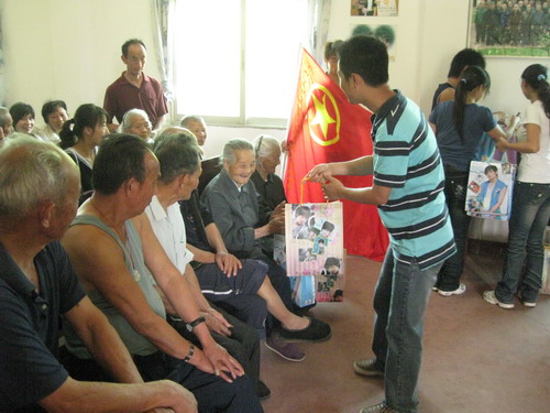 在敬老院活动室里,同学们为老人们表演了精心准备的节目:中华武术、太极、舞蹈、唱歌……一上午的时间很快就过去了,离开时,老人们紧握同学们的手依依不舍。