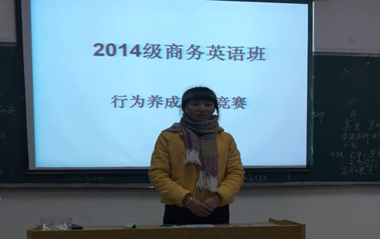 (旅游商务系 刘萍报道)作为职业学校的大学生,学习知识,掌握技能,养成良好的行为习惯是我们每个大学生应该共同遵守的一种行为规范。旅游商务系2014级商务英语班于2015年12月23日晚上19:00在一专401组织开展行为养成教育知识竞赛活动,学生们积极参与,展示自我良好的行为习惯,由刘萍老师组织。
