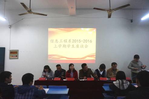 (信息工程系 梁丽)信息工程系于2015年11月20日在第二专业教学楼502召开2015年上学期学生座谈会,参加本次座谈会的有:李晓云主任、刘长万副主任、马龙凤副主任、信息技术教研室主任熊浩老师、电子商务教研室主任余云晖老师、学生管理员韩璐老师以及系部各班班长和学生代表,共80余人。会议由教学管理员梁丽老师主持。