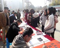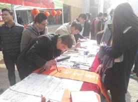 机电工程系全体团总支・学生会成员参加了此次活动。活动现场,前来领春联的同学较多,尽管天气有点冷,书法者手也冻得通红,但也没有减弱他们挥毫泼墨的热情。在《春节序曲》的音乐下,书法者在寒风中现场书写对联和福字,赠送给老师和同学们,让师生们感受到了书法文化的气息和浓厚的节日氛围。有的过往同学就被祝福栏这一质朴而又真挚的感恩方式所吸引,停下脚步为家人、师长、朋友精心挑选小卡片,写上祝福,表达自己最诚挚的感恩之情。活动现场翰墨飘香吸引了广大师生,同学们热情高涨,整个活动洋溢着节日的喜庆。
