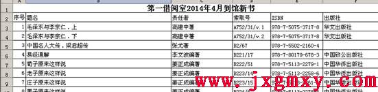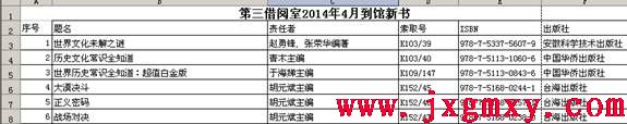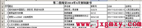 (图书馆刘丽娟 报道)图书馆4月中旬完成了一批新书的编目和上架工作,为了给读者提供最新的书目信息,提高读者的到馆率,增强读者的阅读兴趣,图书馆整理了新书目录,根据图书分类公布了2014年4月各个借阅室的新书通告。新书共638种2821册,其中第一借阅室310种;第二借阅室76种;第三借阅室252种,包括了社会科学、经济、语言、文学、艺术、历史地理、工业、医药卫生、自然科学等书籍,内容丰富。各借阅室新书目已张贴至宣传栏。