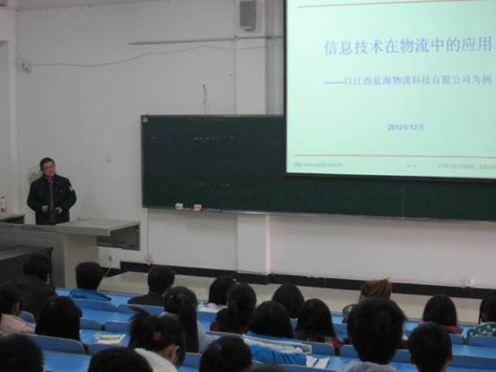 (经济贸易系 涂宇胜报道)2012年12月4日,经济贸易系物流管理专业邀请了江西新华物流的白小松副总经理在一教113举行了题为“信息技术在物流中的应用――以江西蓝海科技有限公司为例”的专业讲座,11物流班和12物流班全体同学参加。白总首先给同学们播放了江西新华物流的企业宣传片,使大家对该公司有了比较全面的了解,激发了对该企业的兴趣。在接下来的时间里,白总结合工作过程中发生的实际案例,讲解了信息技术在物流各领域的应用情况,所讲解的仓储管理系统、运输管理系统、物流信息平台等内容,深化了同学们对物流专业知识的理解。最后,白总留了半小时与同学们进行了交流,同学们就物流企业发展,工作机会,就业选择,专业学习等方面向白总提问,白总以自身的成长经历和企业员工成长的案例为例,鼓励同学们珍惜在校学习机会,积极参与实践活动,加快自身能力的培养。