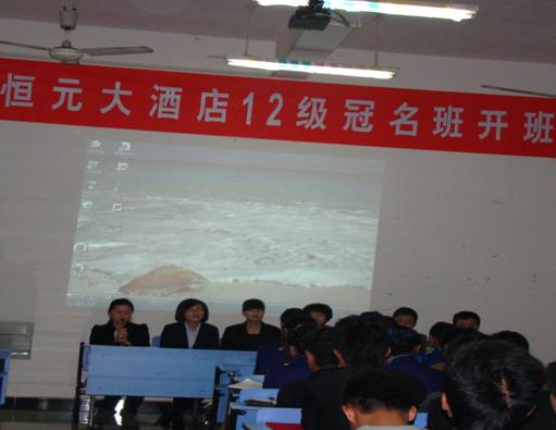 (旅游商务系 梁丽报道)2012年11月16日下午16:00,旅游商务系2011―2012学年“恒元”冠名班11级奖学金颁发暨12级开班仪式在第一专业教学楼504教室举行。宁波市慈溪进出口股份有限公司酒店事业部主任殷梅、酒店人事部主任王银飞、旅游商务系主任潘燕、副主任邬啸峰、餐旅教研室主任王佳、11、12级冠名班班主任和学生参加仪式,仪式由罗志珍老师主持。