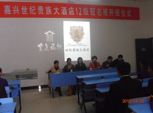 开班仪式上,副主任邬啸峰宣读了2011―2012学年企业奖学金表彰决定,曹总和系领导分别为11级获奖同学颁发奖学金,并为12级冠名班的每位同学发放企业赞助服装费300元。11级学生代表魏陈陈作为 “世纪贵族”冠名班学生代表做了发言,表示在学校会继续努力学习,练好专业技能,为实习做好铺垫。之后曹总对宝莲福邸酒店及酒店周边环境做进行了一个详细的介绍。会上,潘主任还为曹总颁发了酒店管理客座教授聘书。