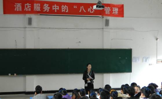 2012年11月23日上午,系部还特邀请曹总在第一教学楼113教室为11、12级酒店管理专业的学生开设“酒店服务中的‘八心’管理”的讲座,曹总从事酒店职业多年,作为一名资深的酒店职业经理人,她将自己从事酒店行业多年的一些亲身经历和感受与同学们一起分享,告诫同学们要珍惜学校时光,努力学习,掌握必要的专业技能,多参加活动锻炼自己的能力。