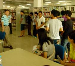 图书馆馆员杨美清和吴震各带领一队馆员为新生介绍图书馆大厅、第一借阅室、第二借阅室、现刊阅览室、第三借阅室、电子阅览室,并为学生讲解一卡通的使用、图书借阅须知、电子资源等。