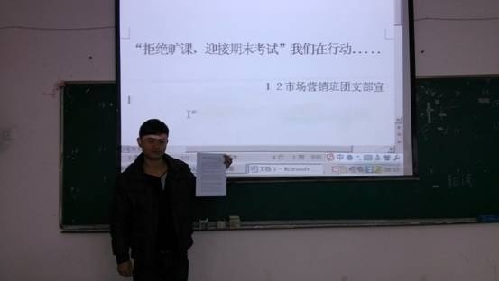 本次活动的主题是“拒绝逃课、从我做起迎接期末考试我们在行动”,由于最近天气气温下降,旷课、迟到现象时有发生,为了迎接期末考试,渲染更好的学习氛围来开展本次活动很有意义。同学们一致表示此次活动能够杜绝具有侥幸心理逃课、迟到的现象,同时也给积极的同学一个提醒,可以让他们“紧张有序”地来安排好时间迎接期末考试。