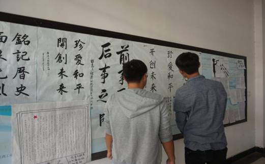 (信息工程系 刘方保报道)为配合学院金秋十月活动,我系在15级学生中征集了以“纪念抗日战争胜利70周年”为主题的书画作品,此活动得到广大的同学的积极参与,共提交了56多副作品。作品中通过硬笔、软笔、手抄报等多种形式呈现了一幅幅的抗战画面。为了使我系学生增强爱国主义教育,缅怀抗日先烈,引导学生牢记历史、珍爱和平、开创未来。我系于11月3日在二专二楼217楼道口举行纪念抗日70周年书画作品展。通过以班级或入党积极分子等多种组织形式进行观摩,大家都纷纷表示,抗日战争中我们的前辈留下了鲜血,我们更应该珍惜来之不易的幸福生活。