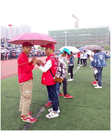 早晨8点,志愿者们到达操场集合做好准备工作。在比赛期间,志愿者们在跑道两旁拉起了警戒线维护比赛秩序。天空时不时的下起雨,但每个人都坚守在自己的岗位上,没有一句怨言,甚至有的志愿者不愿意休息,为了防止意外情况发生,他们还在长跑赛终点线旁造出了一堵人墙,同时也安排了部分志愿者搀扶运动员离开。留在操场上的垃圾也不忘打扫干净,虽然很辛苦,但他们的脸上还是时刻保持着微笑。