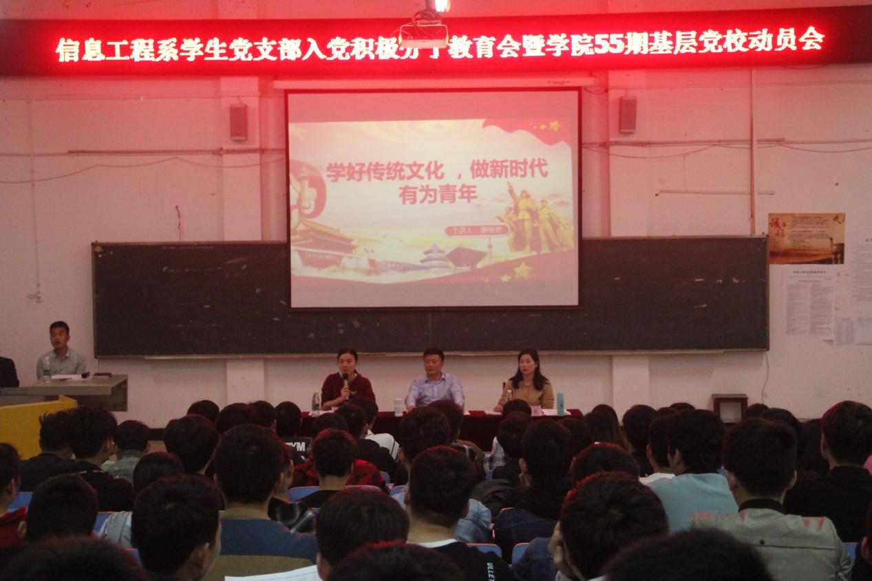 为深入开展红色革命传统教育,推进传承优秀文化,提升新时代青年学生素养,3月29日晚7:00,信息工程系在志学楼113召开了“增强党性•扬帆青春”为主题的入党积极分子教育会暨学院55期基层党校动员大会。本次大会特别邀请了学院党委委员·系党支部书记谢继勇同志为我们开讲传统文化,党支部副书记马龙凤同志及150余名学生干部、入党积极分子和即将参加学院55期基层党校学员共同参加会议,学生支部组织委员晏慧敏同志主持。