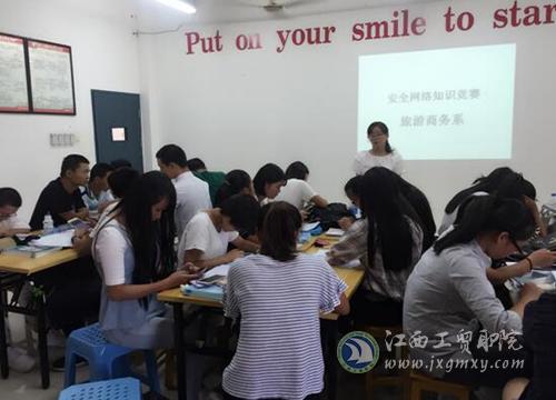 (旅游商务系 刘萍报道)金秋十月,丹桂飘香,为了构建和谐文明的校园生活,提高旅游商务系学生的安全意识,引导大学生树立安全理念。旅游商务系于2016年9月18日上午10:00在一专402开展了一次关于大学生安全知识竞赛的活动。这次活动是以网络知识为主题的知识竞赛,本次活动由各班级选拔的优秀代表共有60多名同学参加,活动由刘萍老师组织。