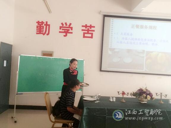 (旅游商务系 胡志莉报道)根据学院教师挂职锻炼管理办法要求,2016年9月27日下午2:20旅游商务系曾希熙老师在一专101西餐实训室进行《西餐服务流程》挂职锻炼成果展示公开教学活动。系主任胡晖、系副主任彭晔、万颖及全体教师参加了本次活动。